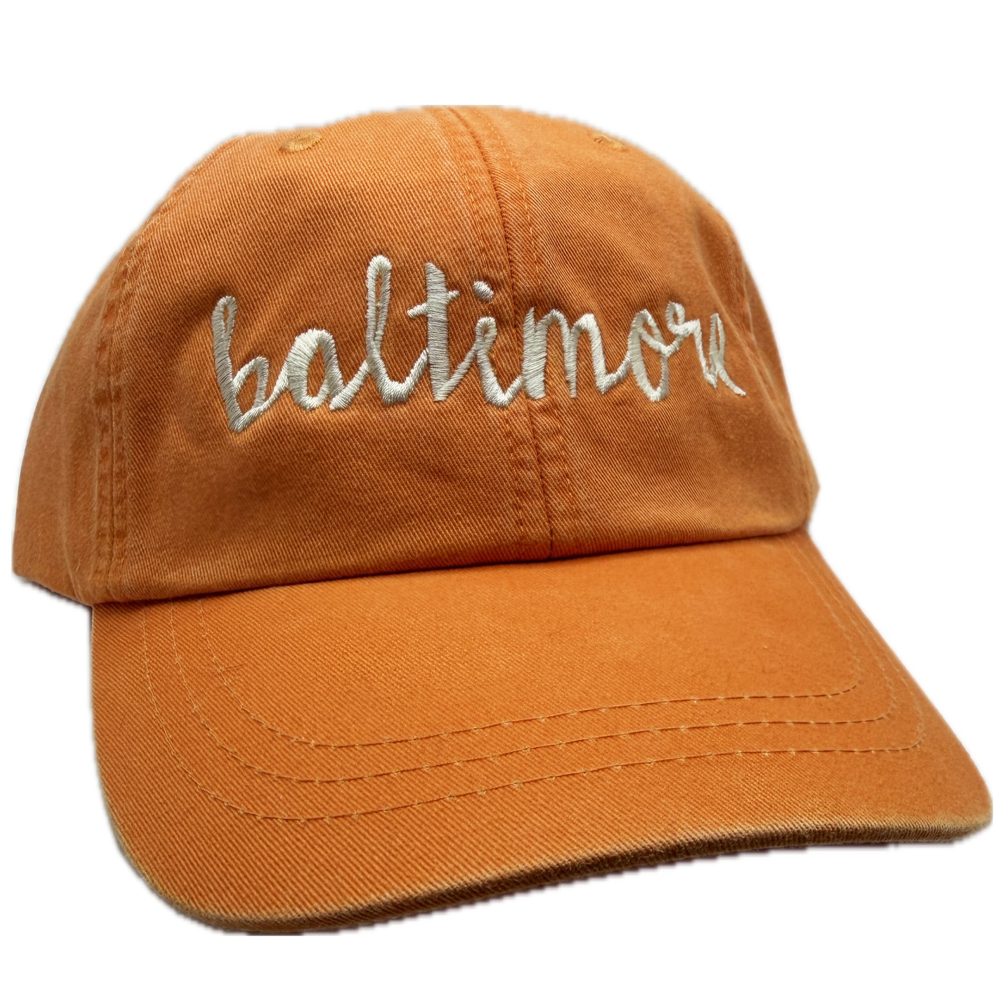 Pigment dyed tangerine dad hat Off white embroidery Leather strap back Embroidered in Baltimore